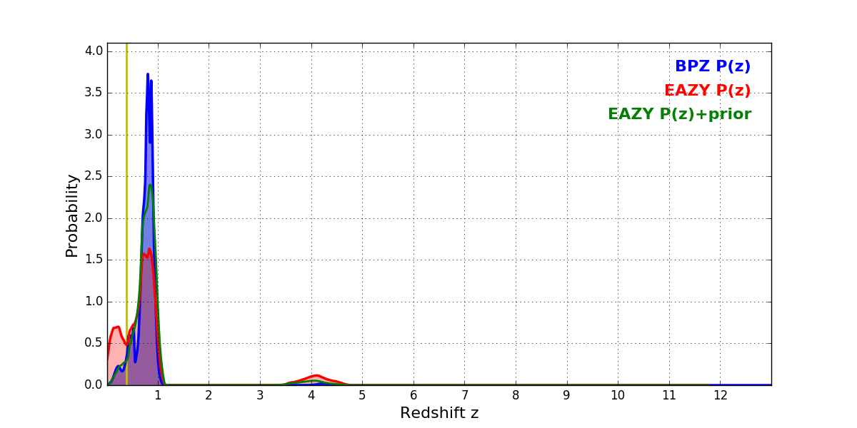 In P(z) plots: Yellow lines mark the cluster redshift z = 0.390,