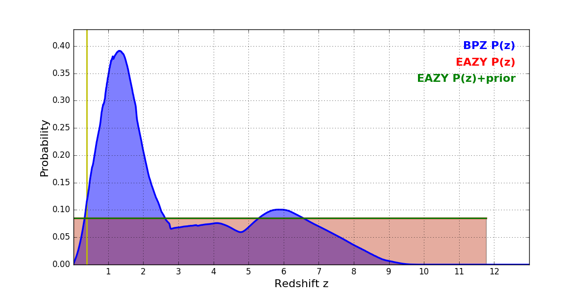 In P(z) plots: Yellow lines mark the cluster redshift z = 0.390,