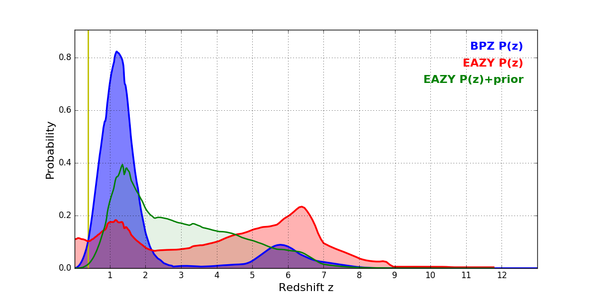 In P(z) plots: Yellow lines mark the cluster redshift z = 0.390,