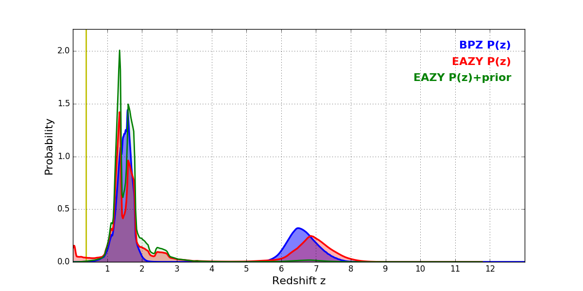 In P(z) plots: Yellow lines mark the cluster redshift z = 0.390,