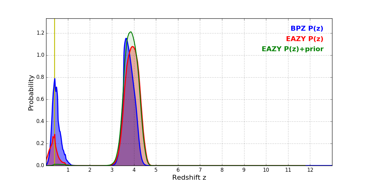 In P(z) plots: Yellow lines mark the cluster redshift z = 0.390,