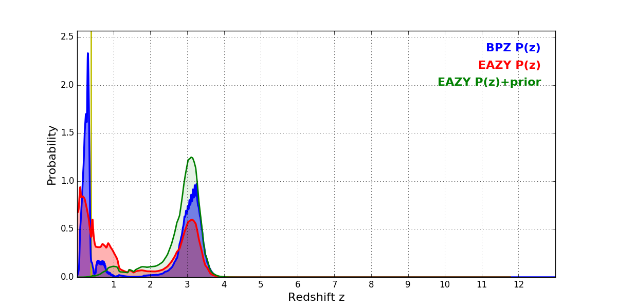 In P(z) plots: Yellow lines mark the cluster redshift z = 0.390,