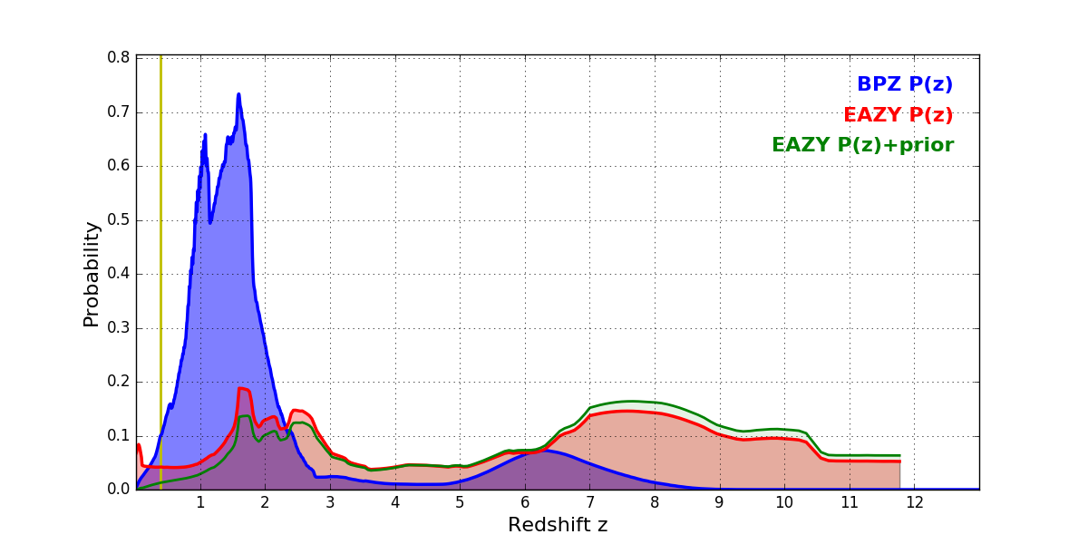 In P(z) plots: Yellow lines mark the cluster redshift z = 0.390,
