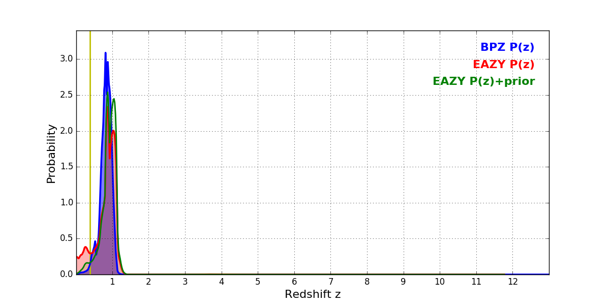 In P(z) plots: Yellow lines mark the cluster redshift z = 0.390,