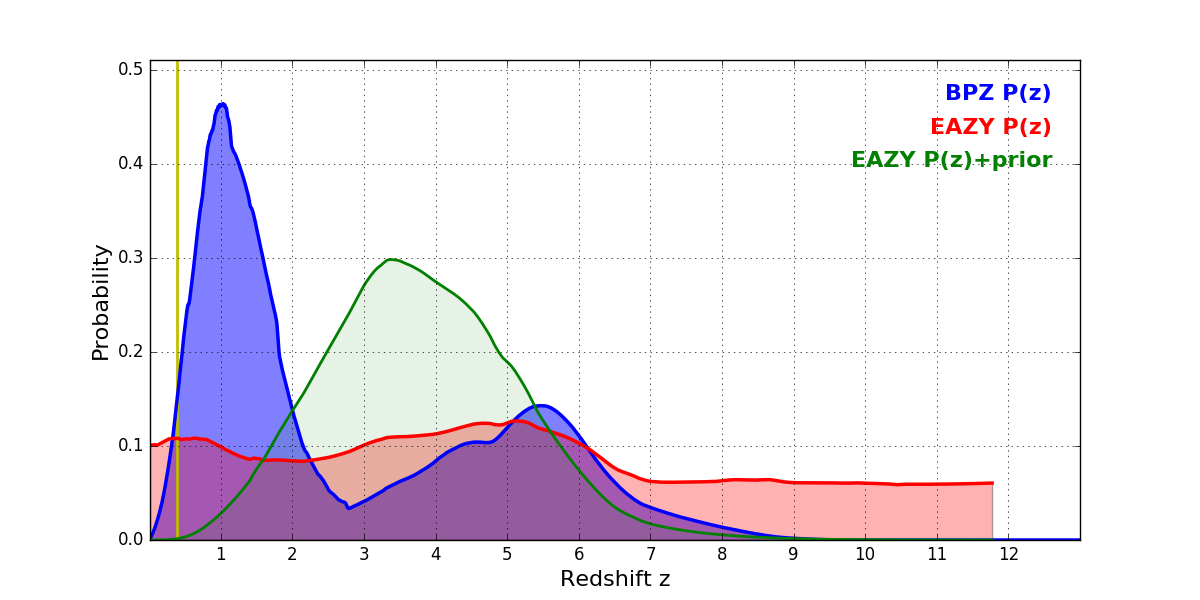 In P(z) plots: Yellow lines mark the cluster redshift z = 0.390,