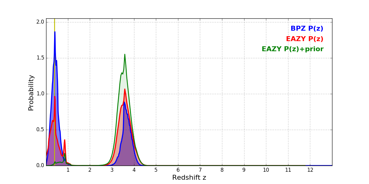 In P(z) plots: Yellow lines mark the cluster redshift z = 0.390,