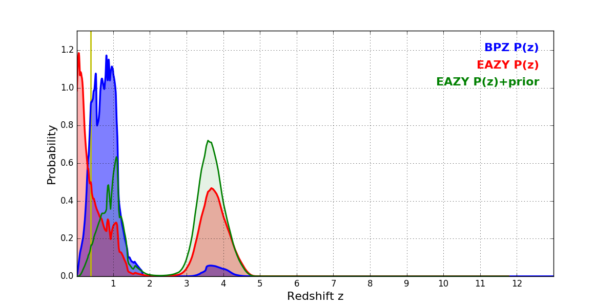 In P(z) plots: Yellow lines mark the cluster redshift z = 0.390,