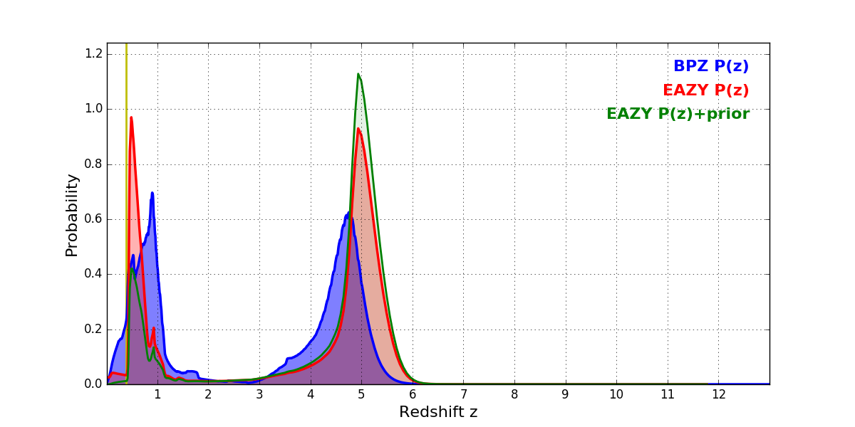 In P(z) plots: Yellow lines mark the cluster redshift z = 0.390,