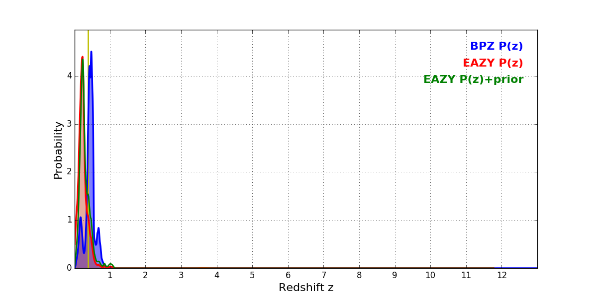 In P(z) plots: Yellow lines mark the cluster redshift z = 0.390,