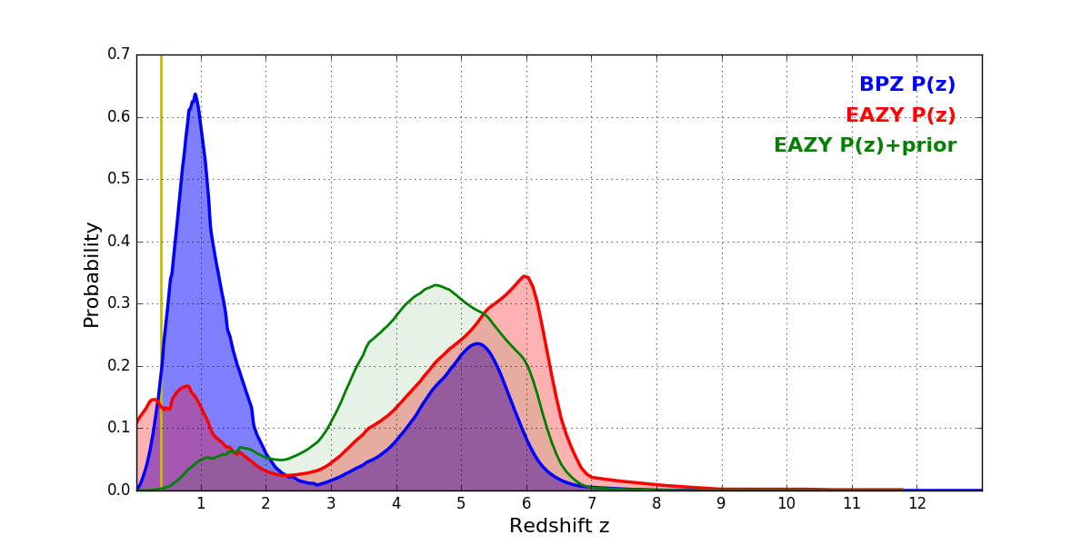 In P(z) plots: Yellow lines mark the cluster redshift z = 0.390,