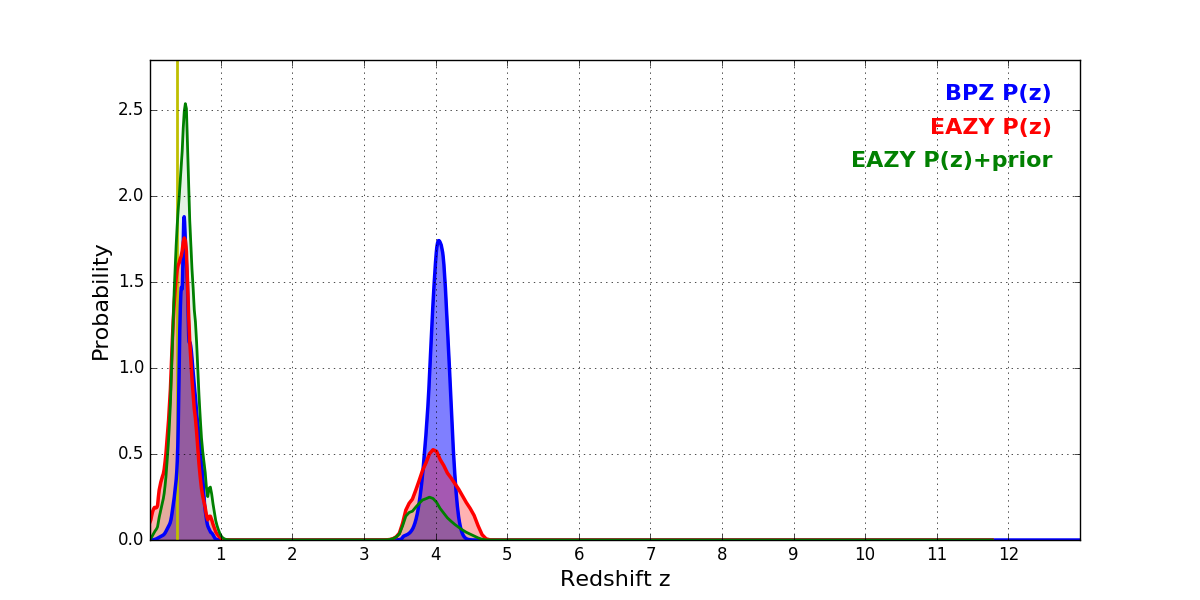 In P(z) plots: Yellow lines mark the cluster redshift z = 0.390,