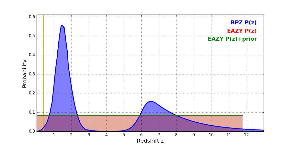 In P(z) plots: Yellow lines mark the cluster redshift z = 0.390,