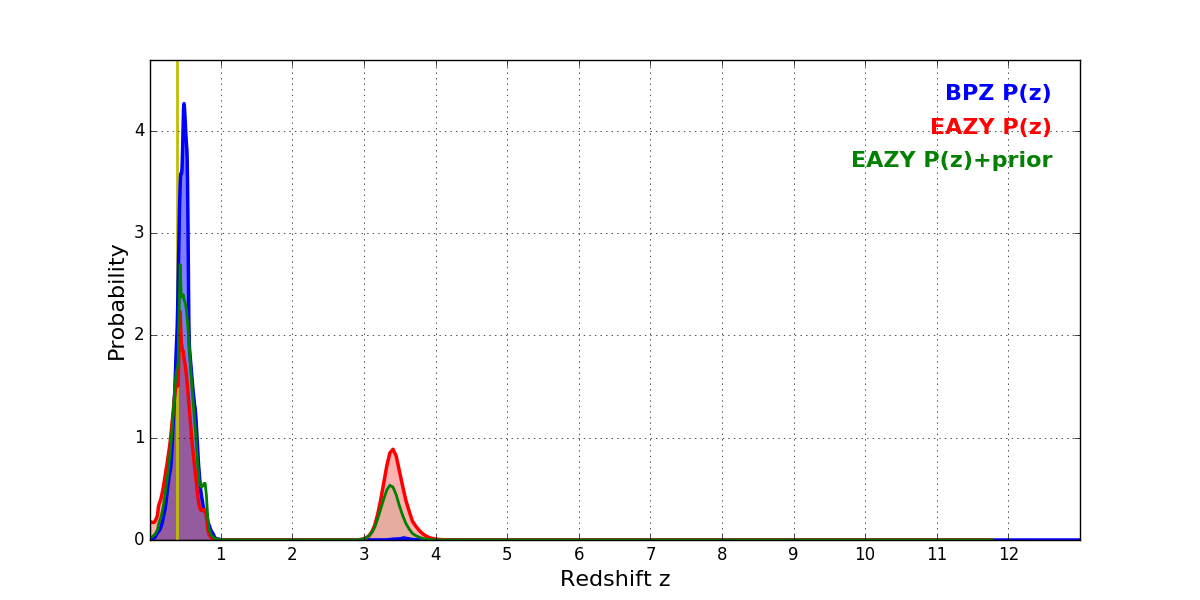 In P(z) plots: Yellow lines mark the cluster redshift z = 0.390,