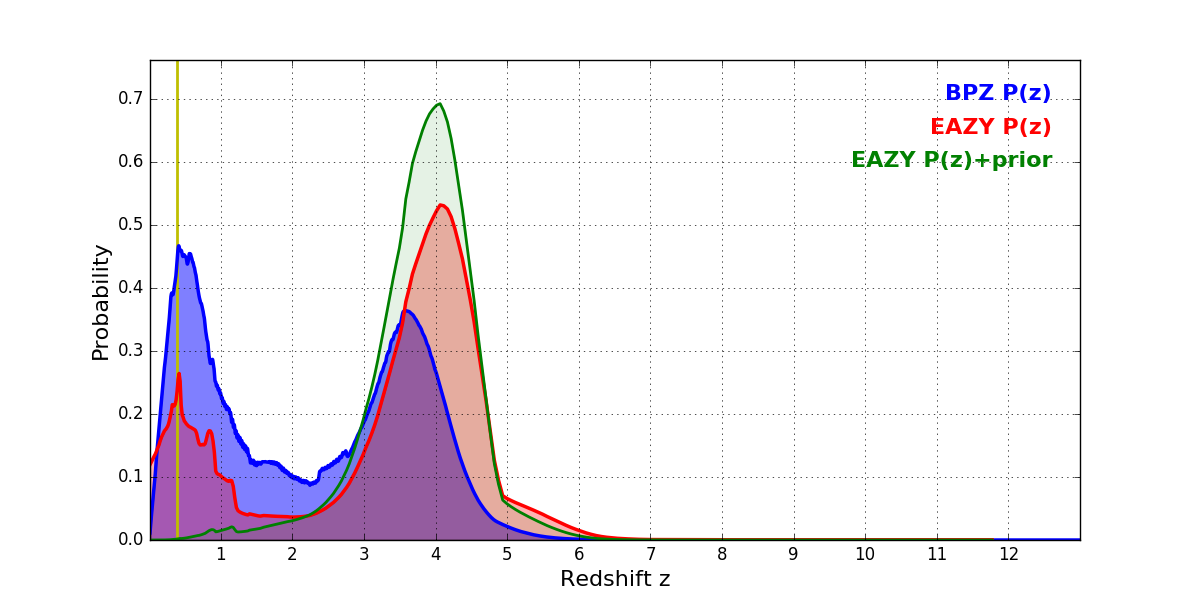 In P(z) plots: Yellow lines mark the cluster redshift z = 0.390,