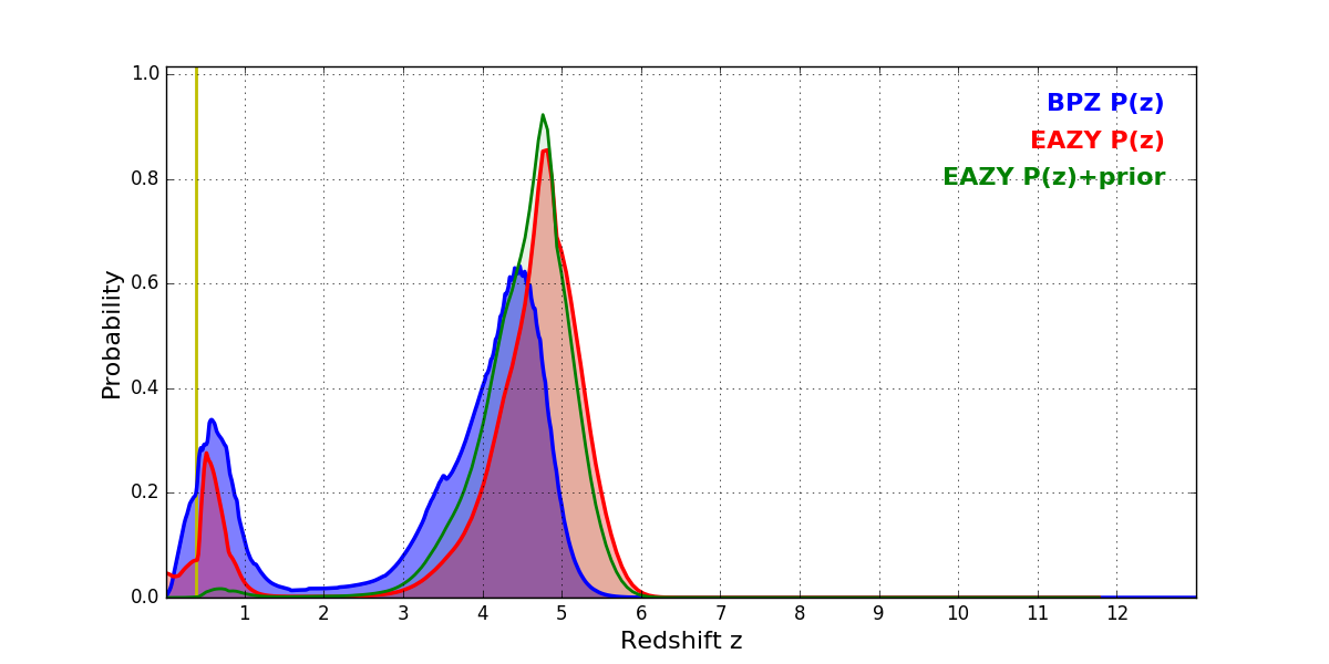 In P(z) plots: Yellow lines mark the cluster redshift z = 0.390,