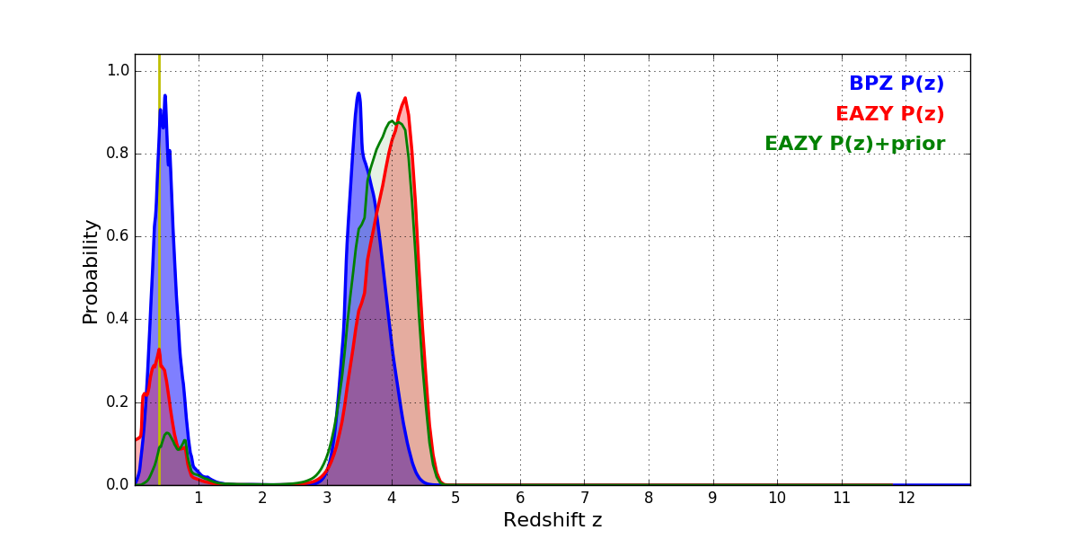In P(z) plots: Yellow lines mark the cluster redshift z = 0.390,
