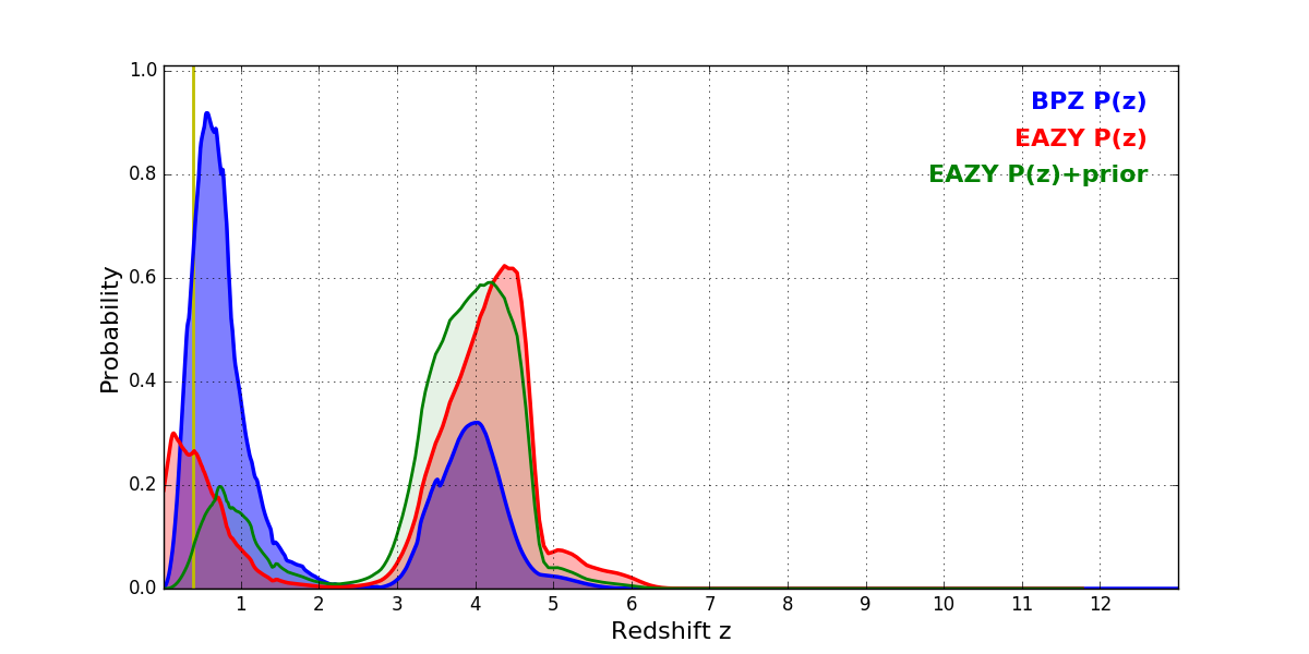 In P(z) plots: Yellow lines mark the cluster redshift z = 0.390,