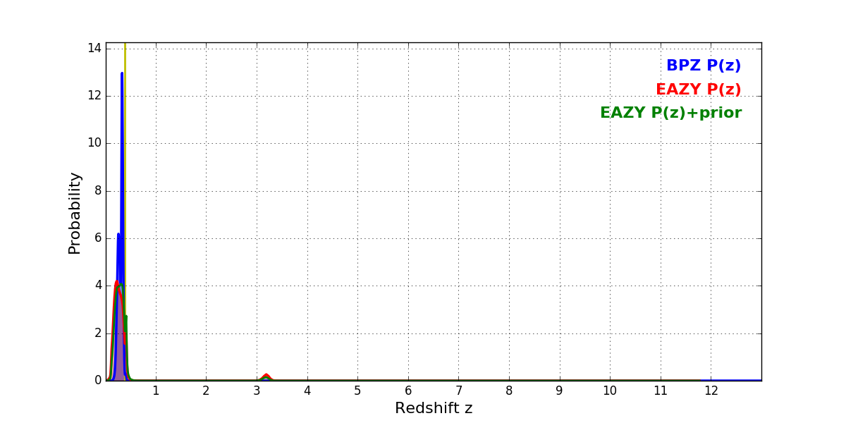 In P(z) plots: Yellow lines mark the cluster redshift z = 0.390,