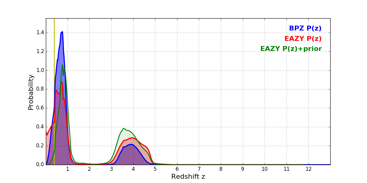In P(z) plots: Yellow lines mark the cluster redshift z = 0.390,