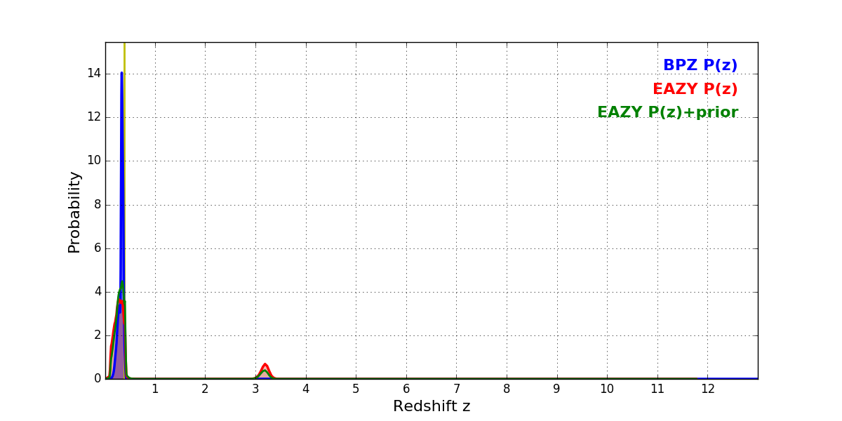 In P(z) plots: Yellow lines mark the cluster redshift z = 0.390,
