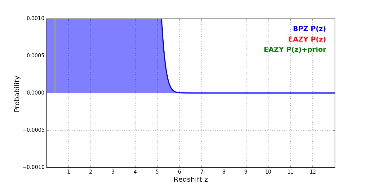 In P(z) plots: Yellow lines mark the cluster redshift z = 0.390,