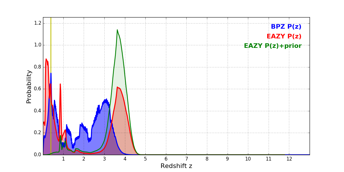In P(z) plots: Yellow lines mark the cluster redshift z = 0.390,