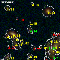 Black segments are analyzed here. Roll mouse over color images to view segments. Best viewed in a wide browser window (1200 pixels or more). Download SED & P(z) plots to view larger versions.