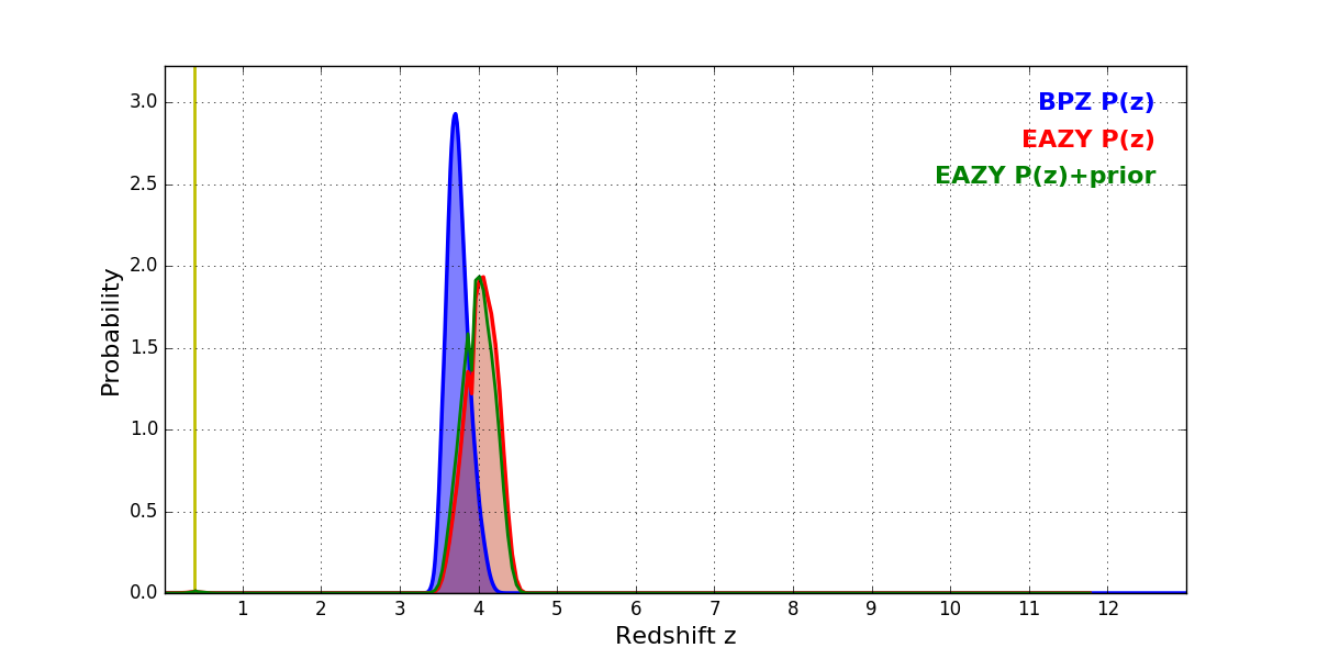 In P(z) plots: Yellow lines mark the cluster redshift z = 0.390,