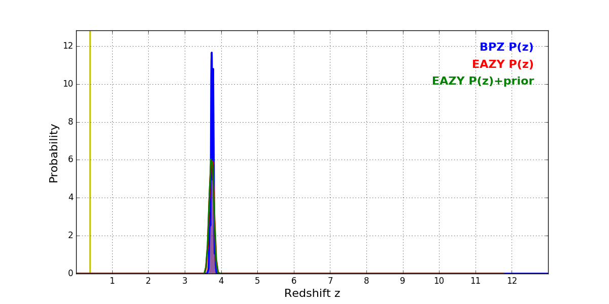 In P(z) plots: Yellow lines mark the cluster redshift z = 0.390,