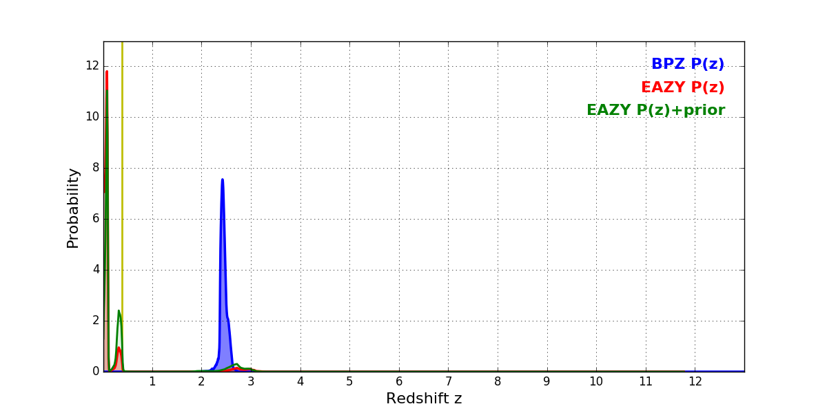 In P(z) plots: Yellow lines mark the cluster redshift z = 0.390,