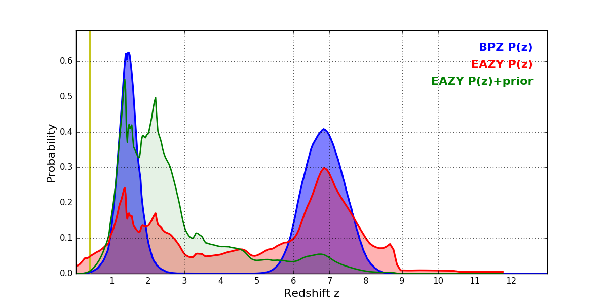 In P(z) plots: Yellow lines mark the cluster redshift z = 0.390,