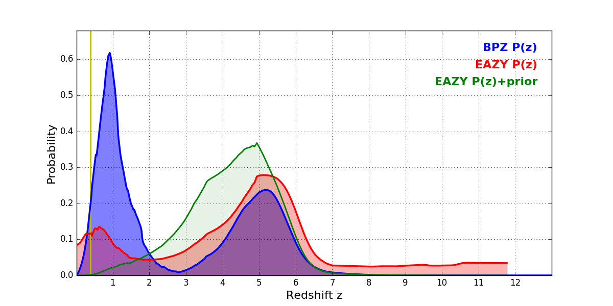 In P(z) plots: Yellow lines mark the cluster redshift z = 0.390,