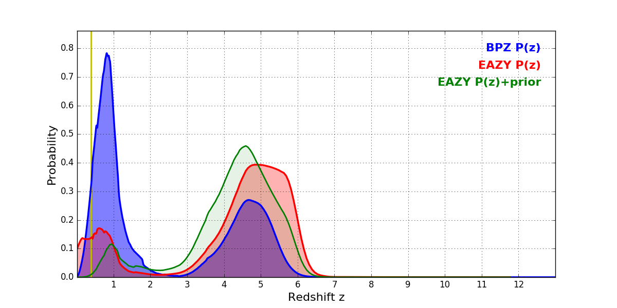 In P(z) plots: Yellow lines mark the cluster redshift z = 0.390,