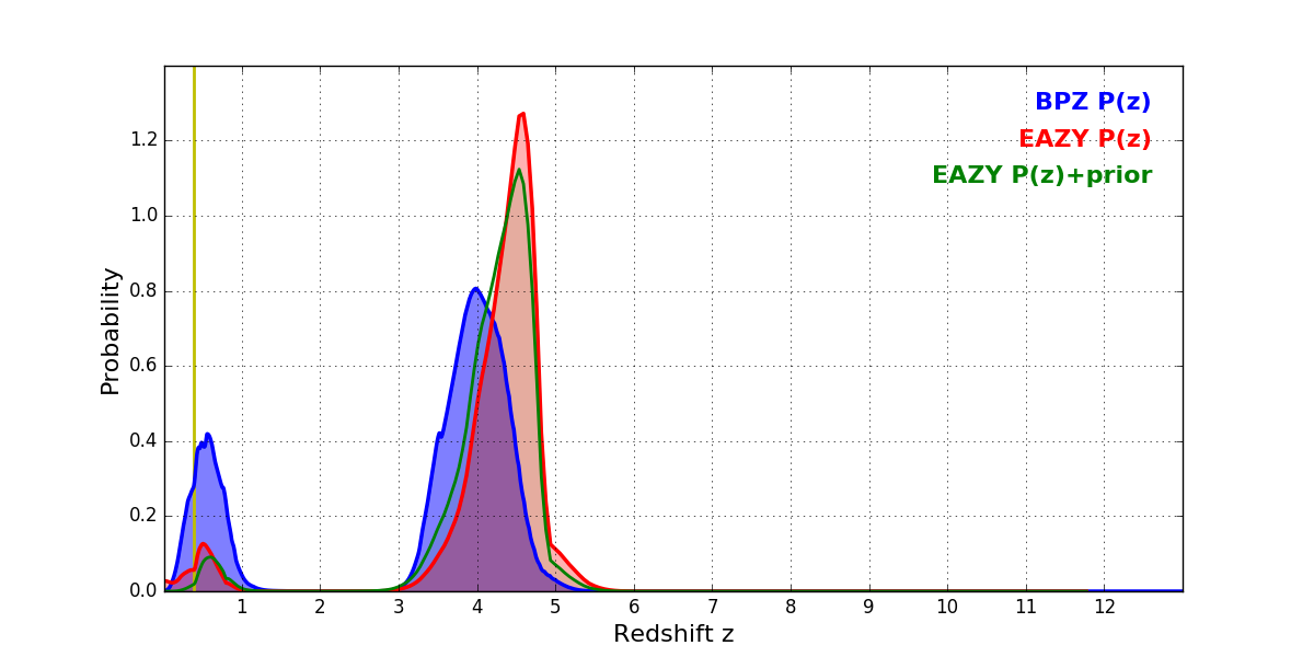 In P(z) plots: Yellow lines mark the cluster redshift z = 0.390,
