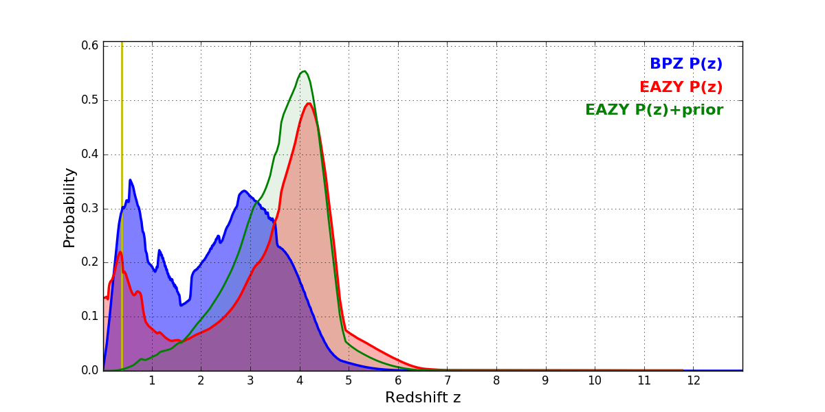 In P(z) plots: Yellow lines mark the cluster redshift z = 0.390,