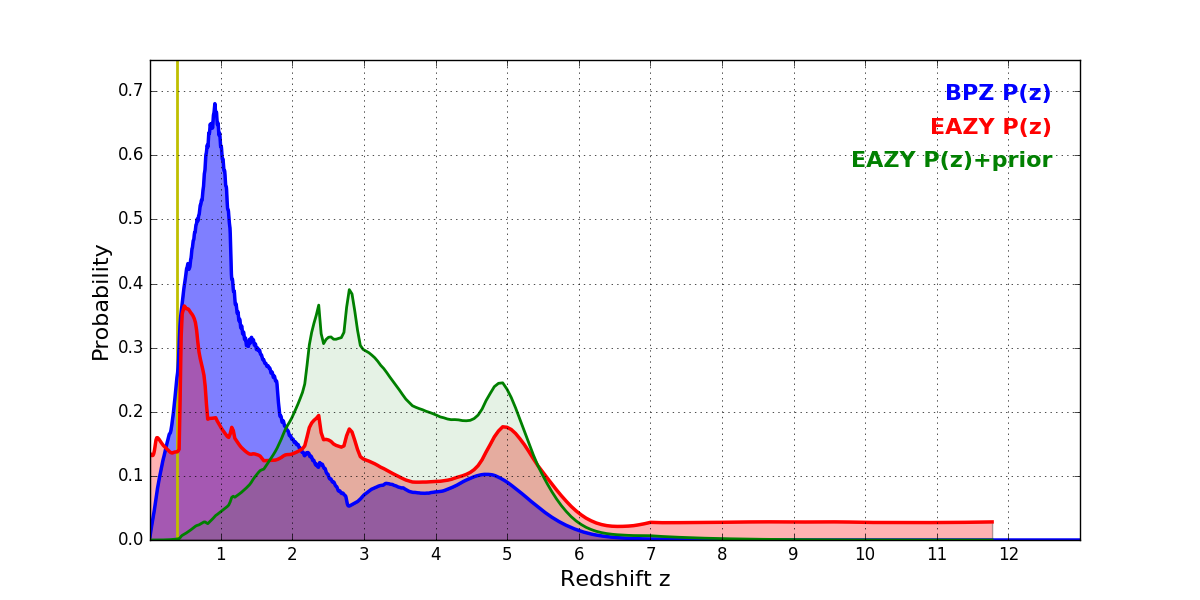 In P(z) plots: Yellow lines mark the cluster redshift z = 0.390,