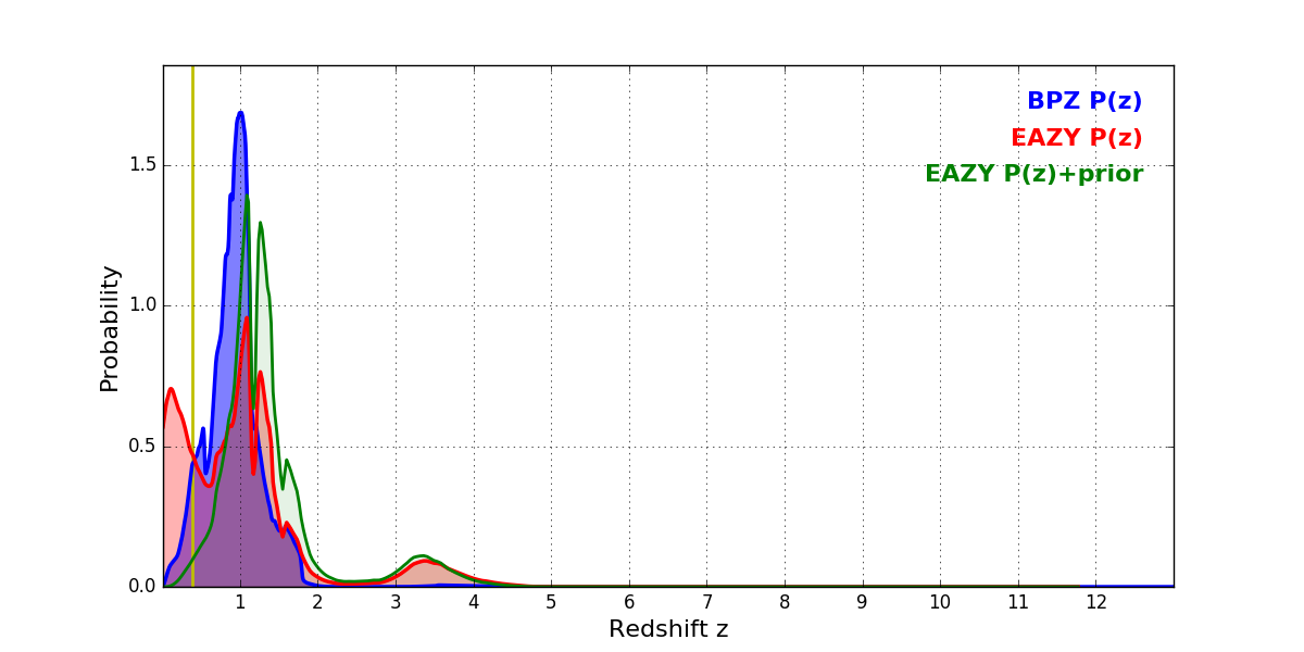 In P(z) plots: Yellow lines mark the cluster redshift z = 0.390,