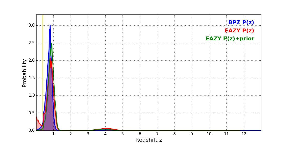 In P(z) plots: Yellow lines mark the cluster redshift z = 0.390,