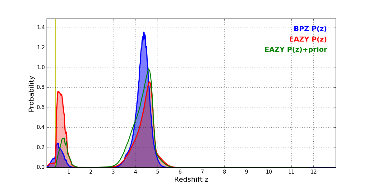 In P(z) plots: Yellow lines mark the cluster redshift z = 0.390,