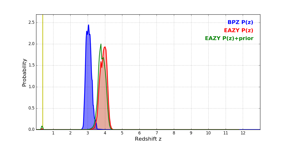 In P(z) plots: Yellow lines mark the cluster redshift z = 0.390,