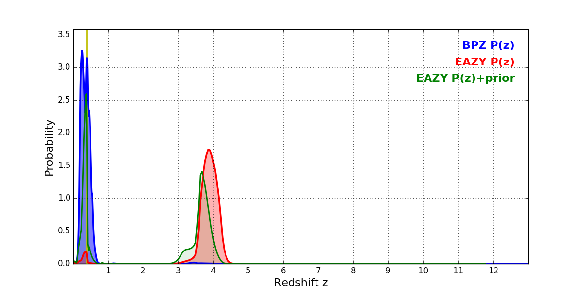 In P(z) plots: Yellow lines mark the cluster redshift z = 0.390,