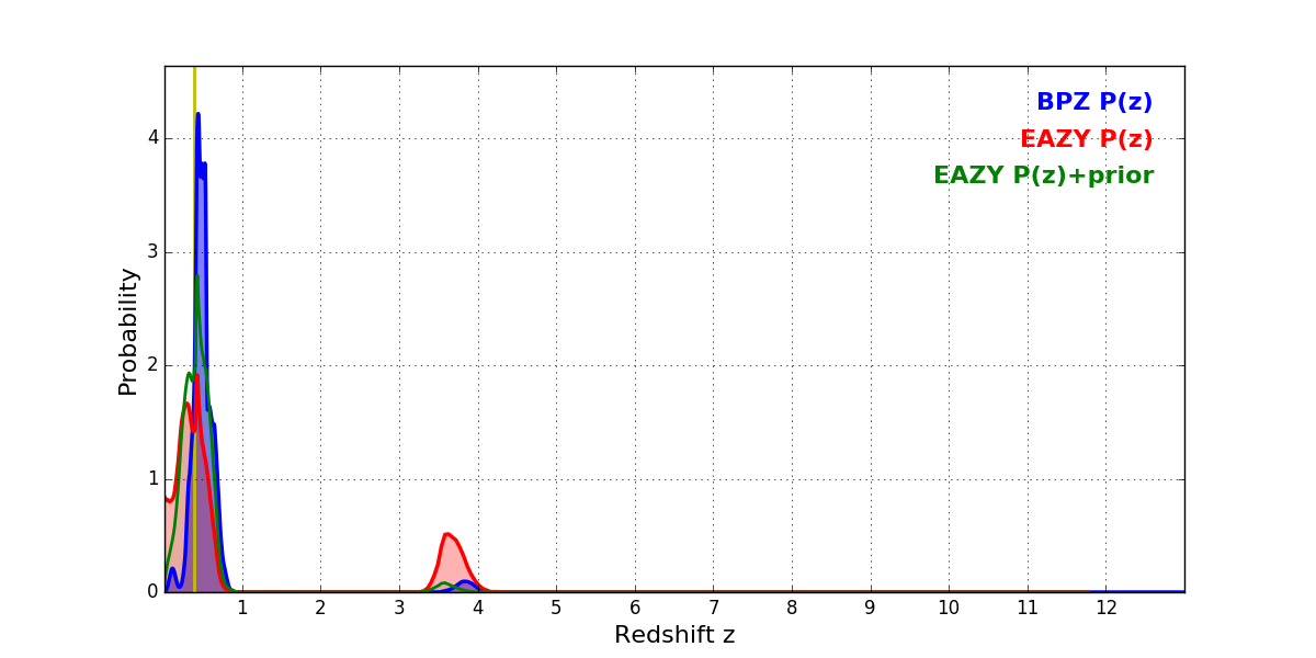 In P(z) plots: Yellow lines mark the cluster redshift z = 0.390,