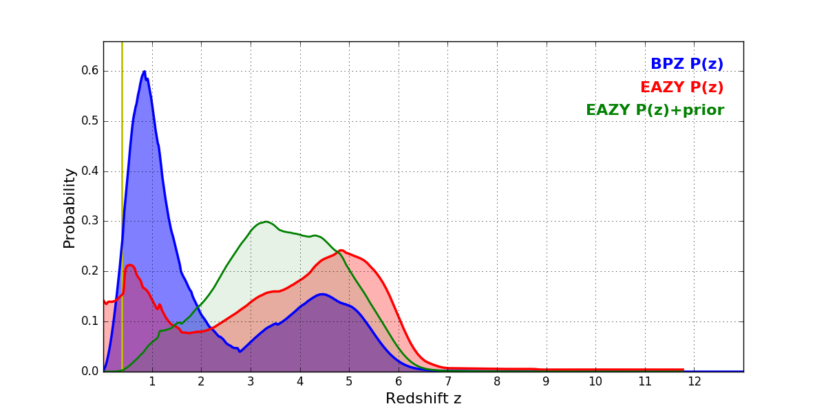 In P(z) plots: Yellow lines mark the cluster redshift z = 0.390,