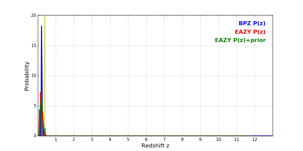 In P(z) plots: Yellow lines mark the cluster redshift z = 0.390,