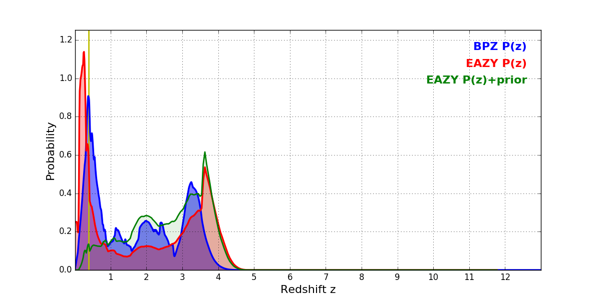 In P(z) plots: Yellow lines mark the cluster redshift z = 0.390,