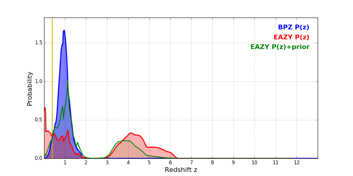 In P(z) plots: Yellow lines mark the cluster redshift z = 0.390,