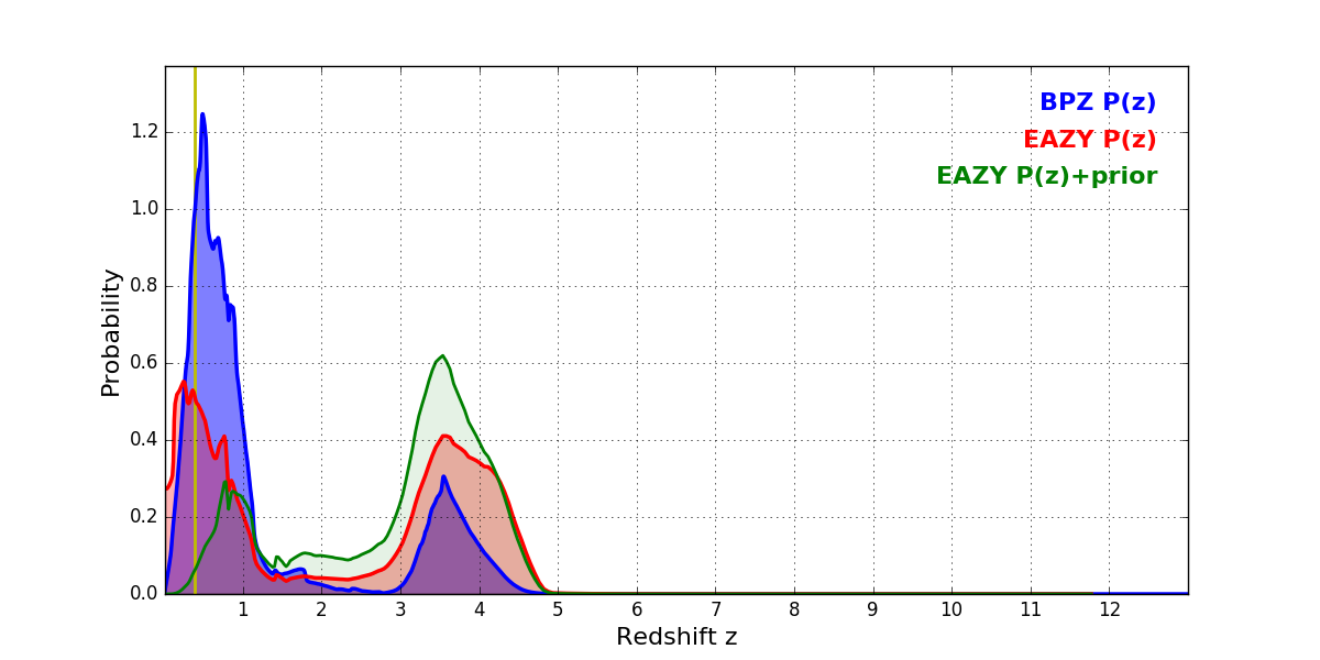 In P(z) plots: Yellow lines mark the cluster redshift z = 0.390,