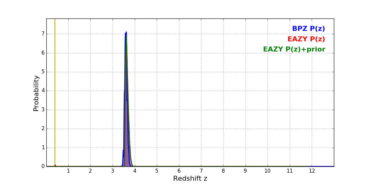 In P(z) plots: Yellow lines mark the cluster redshift z = 0.390,