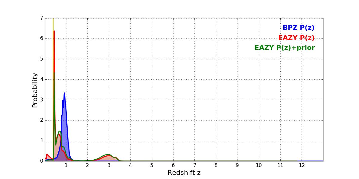 In P(z) plots: Yellow lines mark the cluster redshift z = 0.390,