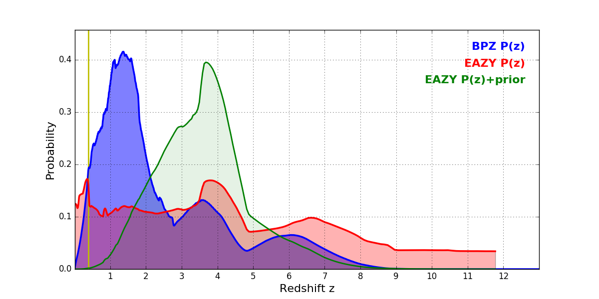 In P(z) plots: Yellow lines mark the cluster redshift z = 0.390,